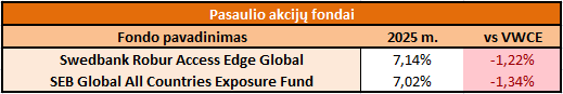 Abu didžiausi šalies bankai – Swedbank ir SEB – siūlo fondus, kurie seka pasaulio akcijų rinkas. Visgi 2025 m. abu šie fondai nuo pigaus ir pasyvaus VWCE atsiliko kiek daugiau nei po vieną procentą.