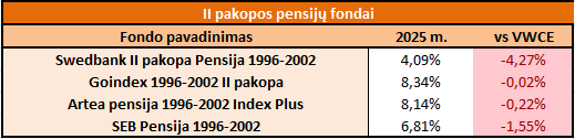 Palyginau kelerius skirtingų valdytojų II pakopos 1996–2002 m. ciklo pensijų fondus. Šie fondai didžiąją dalį turto teoriškai (dar geriau – visą) turėtų investuoti į akcijų rinkas, todėl jų rezultatus lyginti su VWCE yra visiškai korektiška.