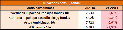 Su III pakopos fondais didelių skirtumų nėra – atsilikimas nuo VWCE visais atvejais kiek didesnis nei II pakopos panašių fondų. Pagrindinė to priežastis paprasta: aukštesni III pakopos fondų valdymo mokesčiai.