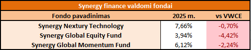 Greitomis užmečiau akį, kaip 2025 m. sekėsi Synergy Finance valdomiems fondams, ir palyginau trijų didžiausių jų fondų rezultatus su VWCE.