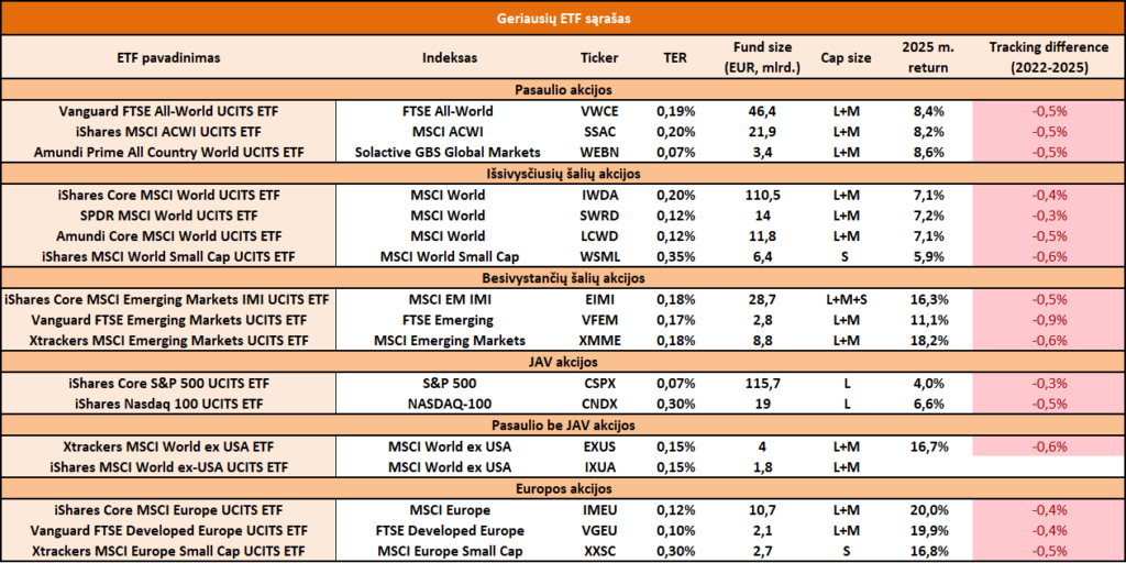 Dar kartą – jei kyla neaiškumų dėl stulpelių reikšmių arba kodėl „tracking difference“ laikau svarbiausiu rodikliu, visą logiką detaliau esu paaiškinęs įraše „Geriausi akcijų ETFs“.