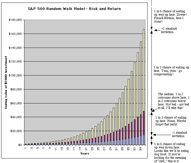Po 40 metų yra 66,7% tikimybė, kad uždarbis bus tarp 14 tūkst. ir 166 tūkst. (arba tarp ~7 % ir ~13 % metinių). O gi skirtumas tarp šių sumų – milžiniškas!