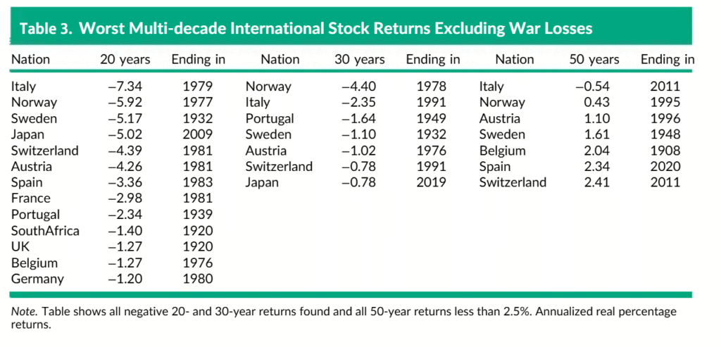 Net ir atmetus tokias šalis, kurių akcijų rinkos istorijos eigoje patyrė visišką krachą (Rusija, Kinija, Vokietija per Antrąjį pasaulinį karą), daugumoje šalių vis tiek pasitaikė ilgamečių periodų, kai akcijų grąža buvo neigiama.