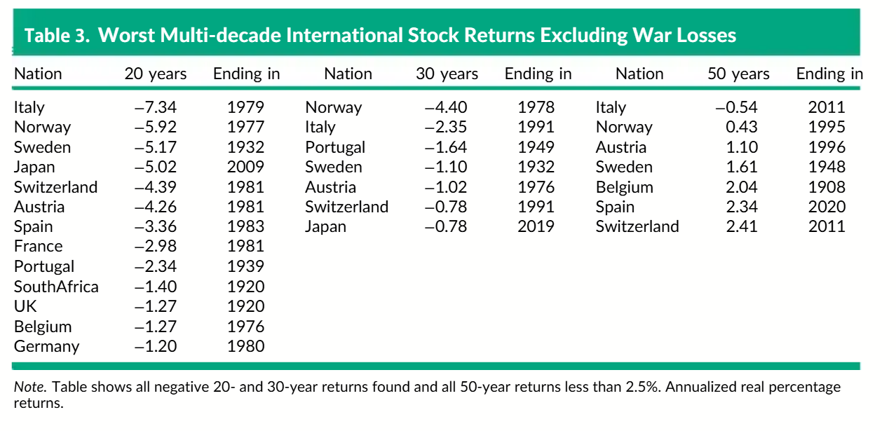 Jo autorius analizavo ilgalaikius įvairių šalių realius akcijų rinkų grąžos duomenis, nagrinėdamas ilgiausius prastus laikotarpius skirtingose šalyse.