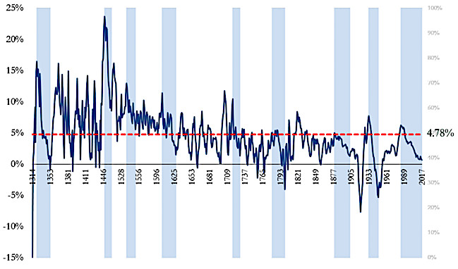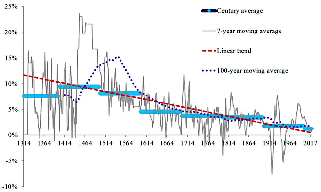 Yra toks Bank of England tyrimas „Eight Centuries of the Risk-Free Rate“, kuriame pateikiama pastarųjų 800 metų saugiausių tuo metu egzistavusių skolos vertybinių popierių pajamingumo istorija (angl. risk-free rate) pasaulyje.