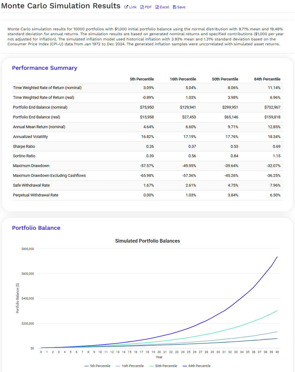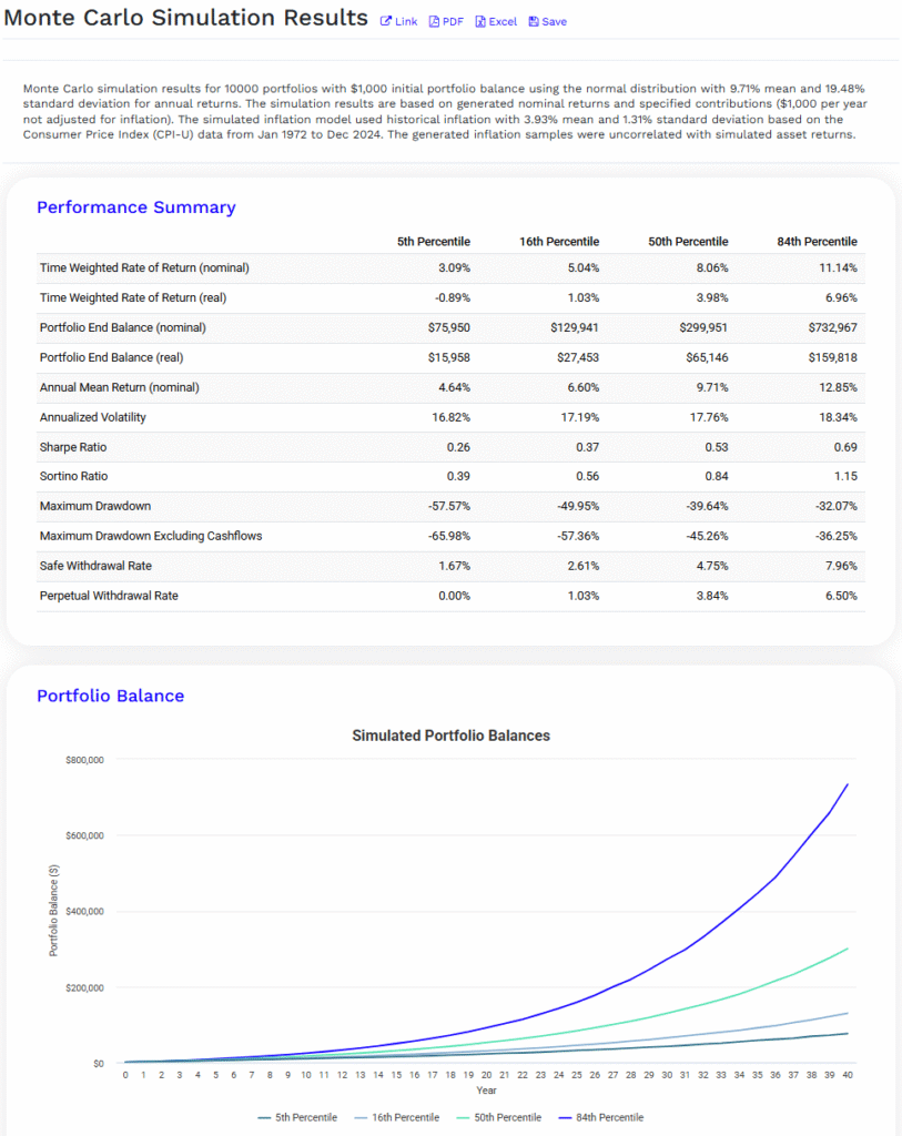 Remiantis paprastu modeliu, pagal kurį uždarbis kasmet svyruoja atsitiktinai, panašia amplitude, kaip svyruoja realios akcijų rinkos (remiantis S&P 500 istoriniais duomenimis), gaunama labiausiai tikėtinų scenarijų distribuciją.