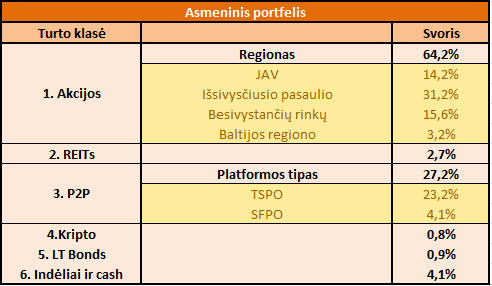 Nuo viso mano portfelio 27,2% sudaro P2P investicijos, kurias skirstau į vartojimo paskolas per tarpusavio skolinimo platformas (23,2%) ir verslo paskolas per sutelktinio finansavimo platformas (4,1%).